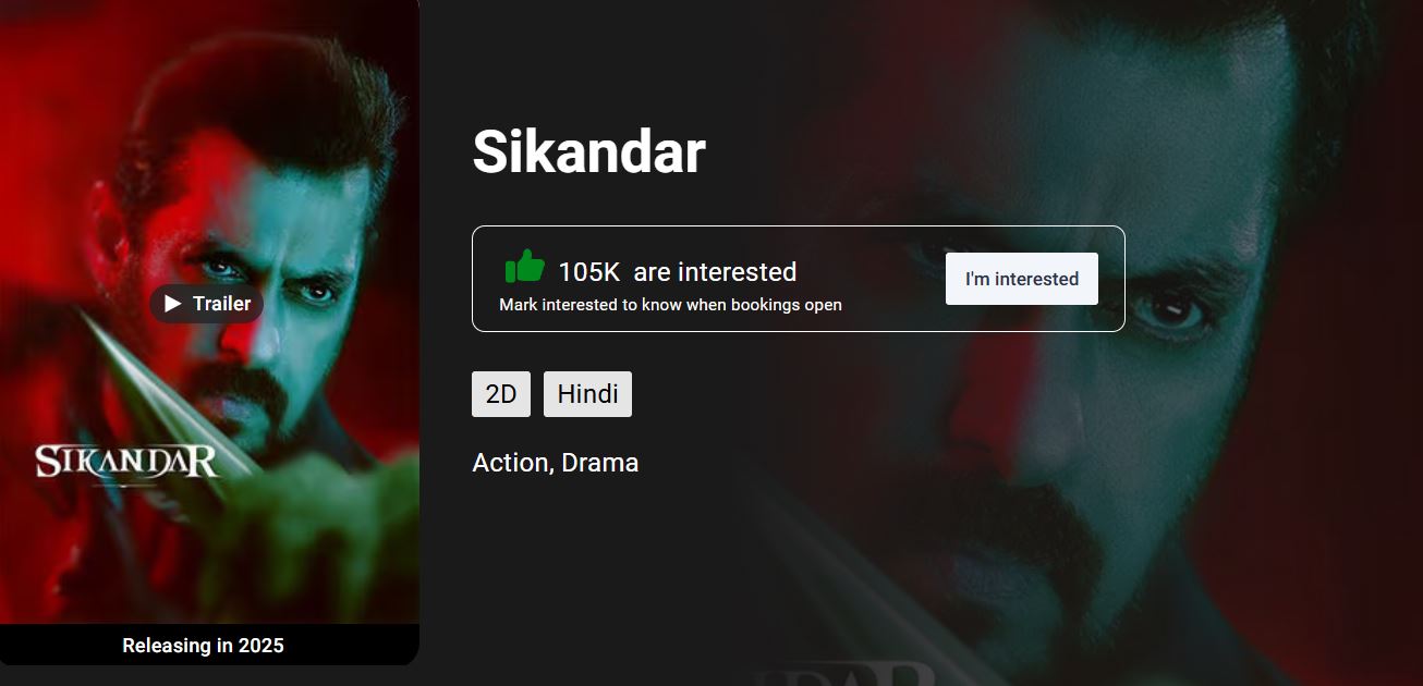 क्रेजी के अलावा एक और फिल्म है, जिसका फैंस बेसब्री से इंतजार कर रहे हैं और यह फिल्म है सिकंदर (Sikandar)। सलमान खान की मोस्ट एंटीसिपेटेड मूवी सिकंदर की एक मात्र झलक ने फैंस को दीवाना कर दिया था। इस फिल्म को रिलीज होने में अभी एक महीने का वक्त है, लेकिन अभी से लोग इसे देखने के लिए इतने बेताब हैं कि उन 105 लाख लोगों ने लाइक का बटन दबाया है जो एडवांस बुकिंग को लेकर बेसब्री से इंतजार कर रहे हैं।