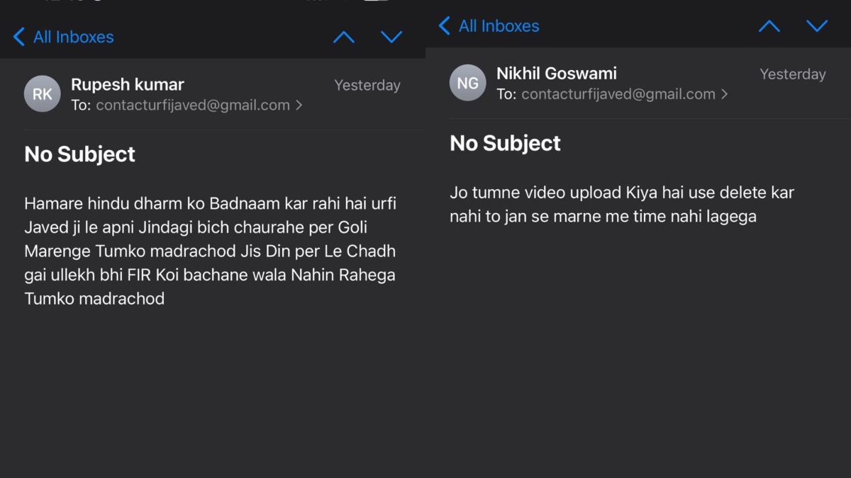 एक शख्स ने उर्फी को मेल करके लिखा, जो तुमने वीडियो अपलोड किया है उसे डिलीट कर, नहीं तो जान से मारने में टाइम नहीं लगेगा। वहीं एक और शख्स ने मेल किया-हमारे हिंदू धर्म को बदनाम कर रही है उर्फी जावेद। जी से अपनी जिंदगी बीच चौराहे पर गोली मारेंगे।