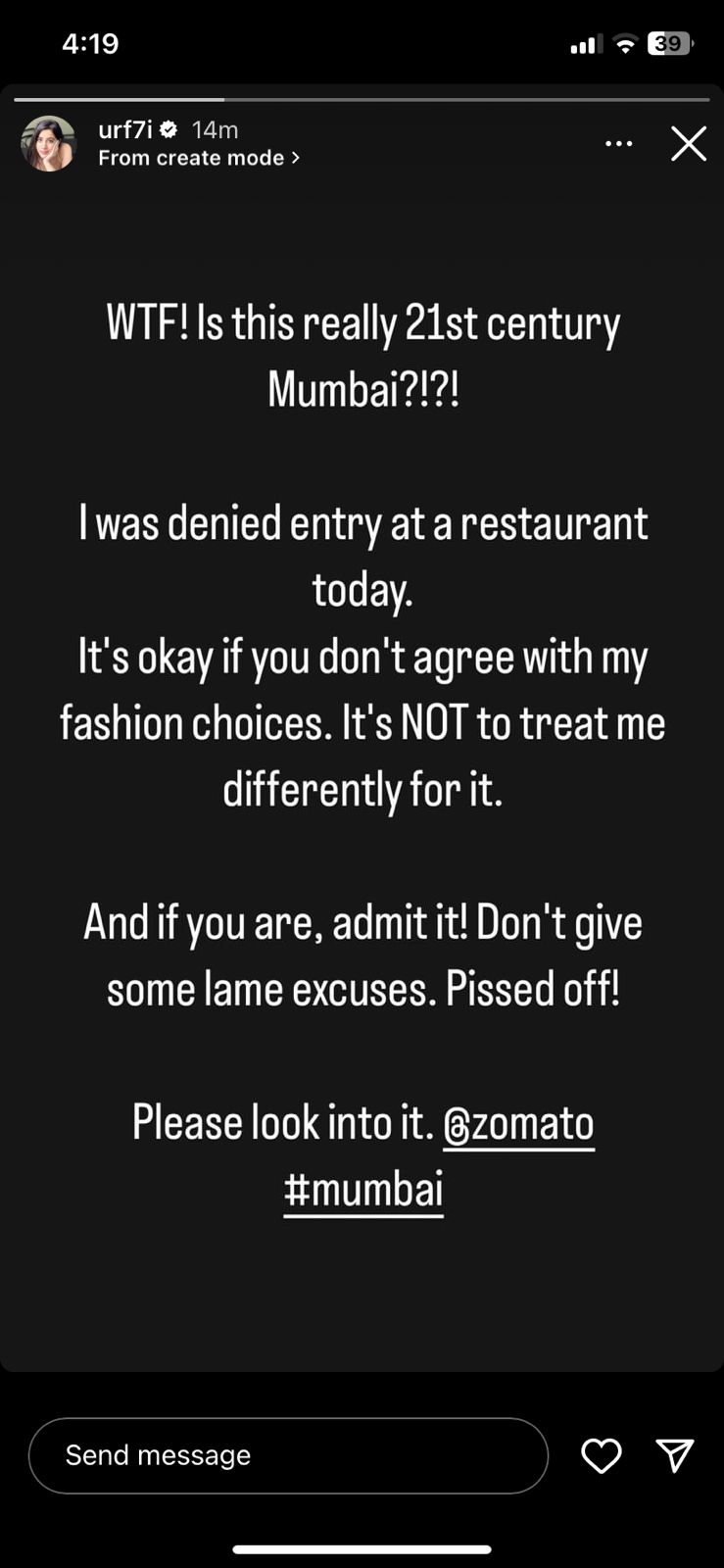 उर्फी ने इंस्टाग्राम स्टोरी पर एक पोस्ट साझा किया है, जिसमे उन्होंने लिखा है, 'मुंबई वालों, क्या ये वाकई 21वीं शताब्दी है? मुझे आज एक रेस्टोरेंट में घुसने से मना कर दिया। अगर आप मेरी फैशन च्वाइस को पसंद नहीं करते तो ठीक है, लेकिन आप मेरे साथ अलग बर्ताव तो नहीं कर सकते हैं। अगर आप फिर भी करते हैं तो खुलकर मानिए, फालतू के बहाने मत बनाइए। एक्ट्रेस ने इस रेस्टोरेंट के खिलाफ एक्शन लिया है।