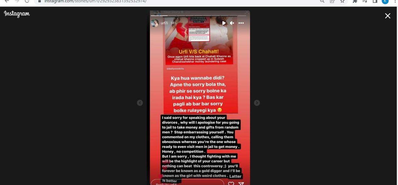 उर्फी ने कहा, "मैनें सॉरी तुम्हारे डाइवोर्स के बारे में बात करने के लिए कहा था। एक रैंडम इंसान से जेल में मिलने और पैसे और गिफ्ट्स लेने के लिए तुम्हें सॉरी क्यों बोलूंगी।' उर्फी यहीं नहीं रुकीं। उन्होंने आगे कहा, 'मुझे लगता है कि मुझसे लड़ाई करना तुम्हारे करियर का हाइलाइटिंग प्वाइंट है, लेकिन इस कंट्रोवर्सी को कोई पीछे नहीं छोड़ सकता। तुमने मेरे कपड़ों पर कमेंट किया, जबकि तुम सुकेश चंद्रशेखर से पैसों के लिए जेल में मिलने जाती थी। तुम हमेशा गोल्ड डिगर के नाम से जानी जाओगी और मैं अजीब अतरंगी कपड़े पहनने के नाम से। मुझे लगता है दूसरा वाला ज्यादा बेटर है।'