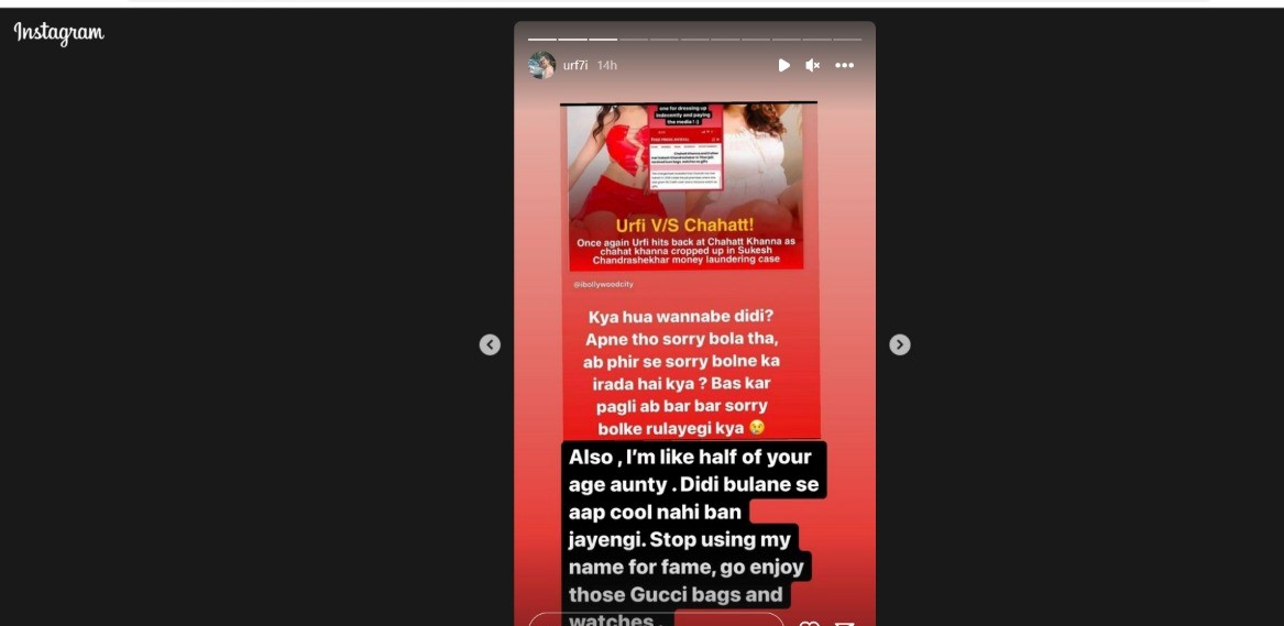 उर्फी यहीं नहीं रुकीं। उन्होंने चाहत को आंटी तक कह दिया। मिस जावेद ने लिखा, 'मैं आपकी उम्र की आधी उम्र की हूं। तो मुझे दीदी मत बुलाओ आंटी। आपको जो गुच्ची बैग्स मिले हैं, उसे इंजॉय करो।'