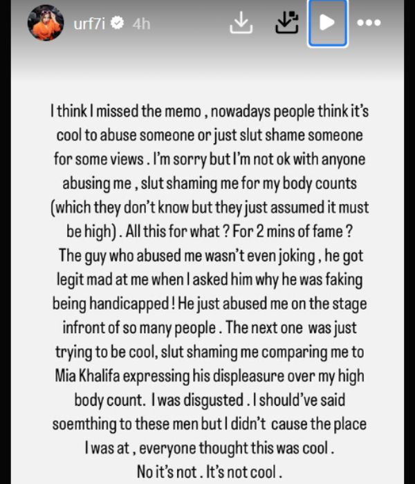 वो आदमी जिसने मुझे गाली दी, मजाक भी नहीं कर रहा था। जब मैंने उससे पूछा कि वह विकलांग होने का नाटक क्यों कर रहा है, तो वह मुझसे सच में गुस्सा हो गया। उसने मुझे मंच पर इतने सारे लोगों के सामने गाली दी। वहीं, दूसरा आदमी बस उस समय कूल बनने की कोशिश कर रहा था, मेरी तुलना मिया खलीफा से कर रहा था और मेरे 'हाई बॉडी काउंट' पर अपनी नाराजगी जता रहा था।