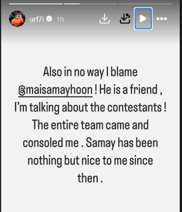 उर्फी जावेद ने बताया कि वह समय रैना से बिल्कुल भी नाराज नहीं है और उनकी पोस्ट उनके खिलाफ नहीं है। शो में कंटेस्टेंट ने उनके ऊपर गलत कमेंट किया। समय और पूरी टीम ने मुझे शांत करने की कोशिश की।