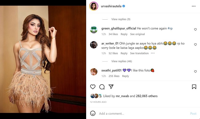 गौरतलब है कि उर्वशी रौतेला और ऋषभ पंत के बीच वाक युद्ध हुआ थाl दोनों की लड़ाई सोशल मीडिया के माध्यम से कई दिनों तक चली थीl हालांकि बाद में दोनों ने मामले पर चुप्पी साध ली थी लेकिन दोनों को इसे लेकर लगातार ट्रोल किया जा रहा हैl उर्वशी रौतेला फिल्म इंस्पेक्टर अविनाश में नजर आएंगीl