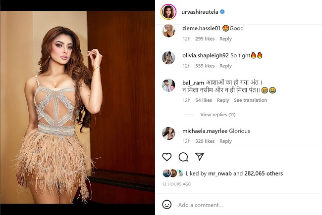 उर्वशी रौतेला की तस्वीरें सोशल मीडिया इंस्टाग्राम पर काफी पसंद की जा रही हैl इसे 12 घंटे में 282000 से ज्यादा लाइक्स मिले हैंl वहीं इस पर ढाई हजार के करीब कमेंट किए गए हैंl कई लोगों ने तस्वीरों पर आई लाइक दिस फोटो, गॉर्जियस पिक्चर, ग्लोरियस, वेरी गुड जैसे कमेंट किए हैंl