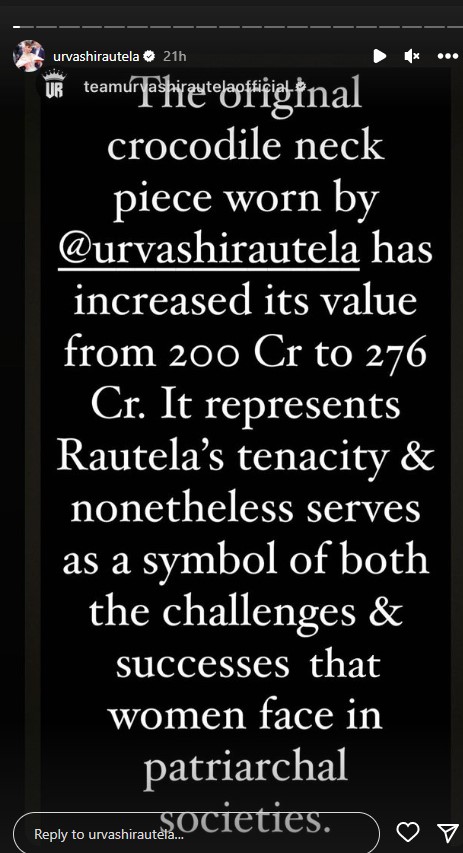 एक्ट्रेस की पीआर टीम की ओर से एक पोस्ट शेयर किया गया, जिसमें लिखा ''उर्वशी रौतेला द्वारा पहने गए ओरिजनल क्रोकोडाइल नेकपीस की कीमत 200 करोड़ से बढ़कर 276 करोड़ रुपये हो गई है। यह रौतेला की दृढ़ता का प्रतिनिधित्व करता है। यह नेकलेस उस चैलेंज और सक्सेस का भी प्रतीक है, जिसे महिलाएं इस सोसाइटी में फेस करती हैं।''