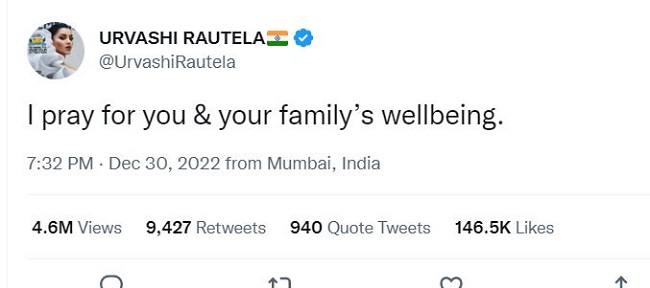 ऋषभ पंत इस वर्ष उर्वशी रौतेला के साथ हुई लड़ाई को लेकर खबरों में थे। शुक्रवार को उन्होंने ट्वीट किया है, 'मैं आपके और आपके परिवार की सुरक्षा के लिए प्रार्थना कर रही हूं।' इस पर एक फैन ने कमेंट करते हुए लिखा है 'सब वो अच्छा हो जाएगा। क्या आप नाम लिख सकती हो।' एक अन्य ने लिखा है, 'क्या यह प्रधानमंत्री नरेंद्र मोदी के लिए तो नहीं है जिनकी माता जी का भी शुक्रवार को निधन हुआ है।'