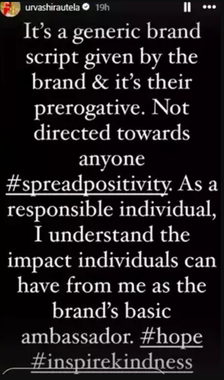 उर्वशी रौतेला ने बढ़ती हुई ट्रोलिंग को देखते हुए अब अपनी सफाई देते हुए अपने आधिकारिक इंस्टाग्राम अकाउंट पर एक पोस्ट शेयर किया है। इस पोस्ट को करते हुए उन्होंने लिखा, "ये एक जनरल ब्रांड स्क्रिप्ट है और उनका नजरिया है। किसी पर भी डायरेक्ट निशाना नहीं साधा गया है।
