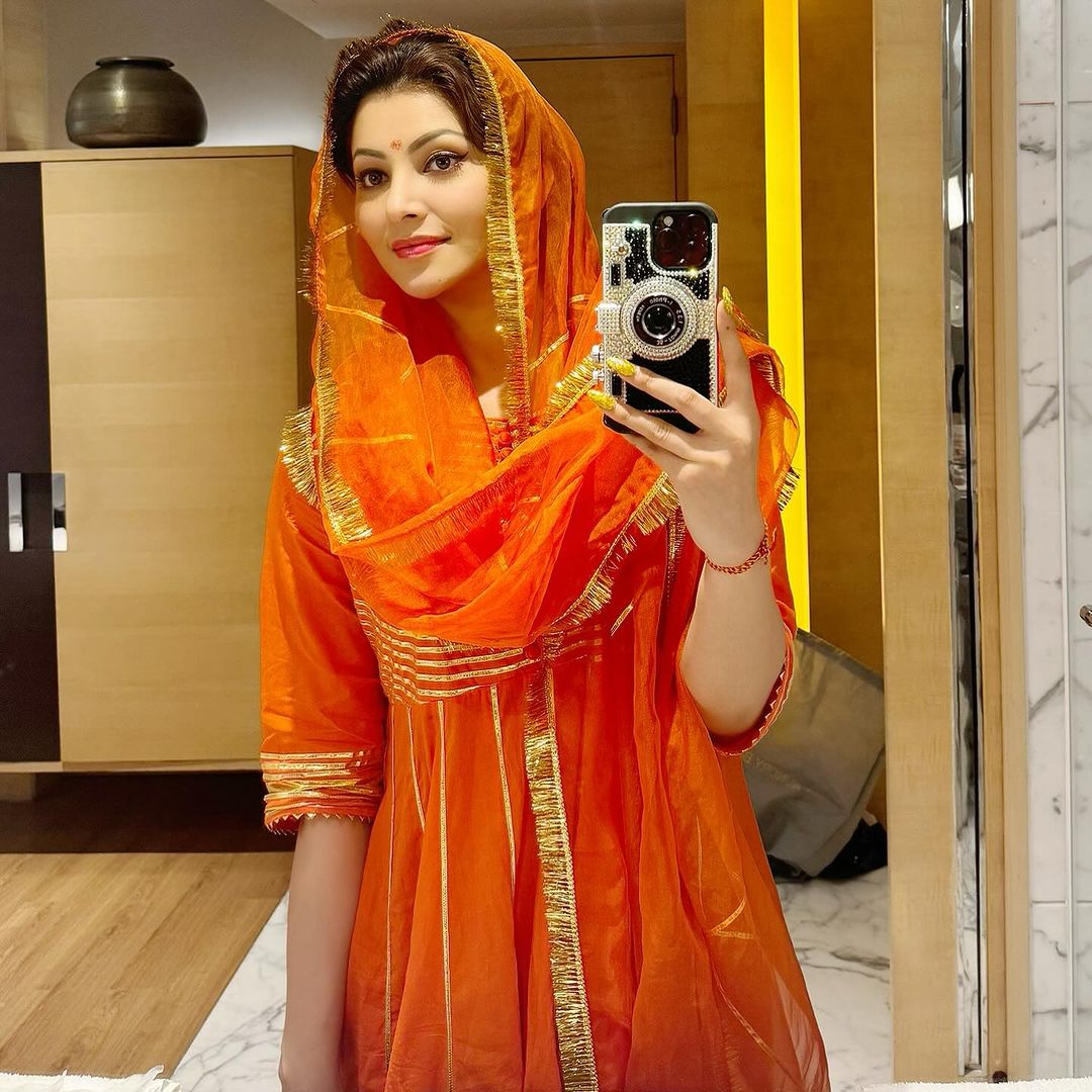 Urvashi Rautela पर चढ़ा भगवा रंग का खुमार , बोल्डनेस की छवि तोड़ देसी लुक में आईं नजर