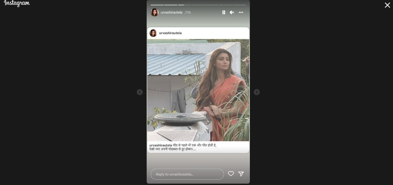 अक्सर ग्लैमरस अंदाज में दिखने वाली उर्वशी ने सिंपल साड़ी में इंस्टाग्राम पर कुछ घंटों पहले एक पोस्ट शेयर की। फोटो कुछ ज्यादा क्लियर नहीं है। उनके गले में मंगलसूत्र, मांग में सिंदूर और चेहरे पर मायूसी दिख रही है। मानो यह किसी अपकमिंग प्रोजेक्ट से ली गई तस्वीर हो। उर्वशी के पीछे किसी मेकअप आर्टिस्ट का हाथ भी दिख रहा है। इस तस्वीर को शेयर करते हुए मिस यूनिवर्स (उर्वशी 2012 और 2015 में मिस यूनिवर्स बनी थीं) ने लिखा, 'मौत से पहले भी एक मौत होती है। देखो जरा अपनी मोहब्बत से दूर होकर।'