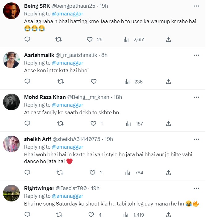 एक अन्य यूजर ने लिखा, 'ऐसा लग रहा है भाई बैटिंग करने जा रहे हैं और डांस करते हुए उसी का वॉर्मअप कर रहे हैं।' इसी तरह ढेरों लोगों ने सलमान खान के डांस का मजाक बनाया है। यूजर्स को उनके स्टेप्स गाने से मैच करते नहीं लग रहे।