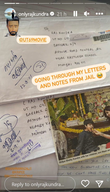 राज कुंद्रा ने अपने सोशल मीडिया हैंडल इंस्टाग्राम पर एक स्टोरी शेयर की है। इस स्टोरी में उन्होंने कुछ चिट्ठियों की फोटो दिखाई है। तस्वीरों में देखा जा सकता है कि जो चिट्ठियां नजर आ रही हैं, उन पर राज कुंद्रा के बैरक का पता यूटी 69, बैरक 6/4 लिखा हुआ दिखाई दे रहा है। बता दें कि यह वही पता है, जहां राज कुंद्रा को आर्थर रोड जेल के अंदर रखा गया था।