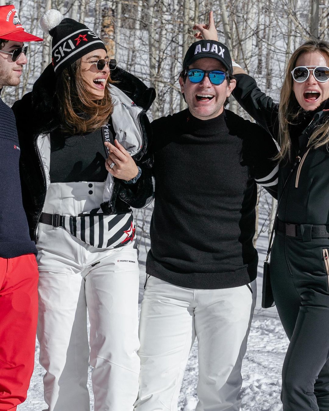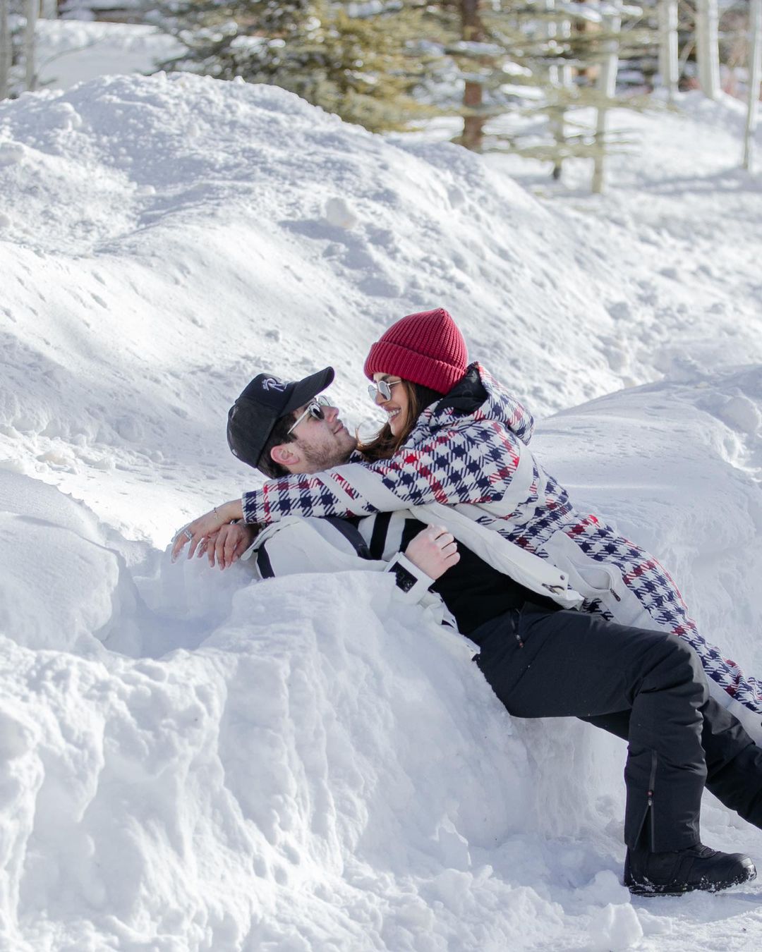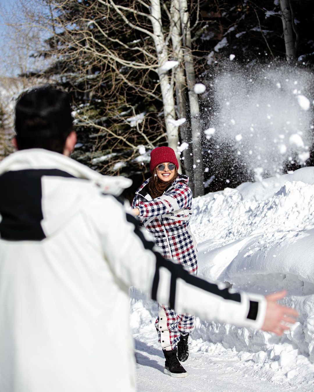 निक और प्रियंका बर्फ में एंजॉय करते दिखाई दे रहे हैं। एक्ट्रेस के लुक की बात करें तो उन्होंने व्हाइट कलर का जंपसूट पहना हुआ है जिसमें रेड और ब्लू कलर के चैक प्रिंट्स बने हुए हैं। इसी के साथ ग्रे शेड्स भी कैरी किए हुए है। दूसरी ओर, निक कैप के साथ ब्लैक एंड व्हाइट ट्रैक सूट में हैंडसम लग रहे है।