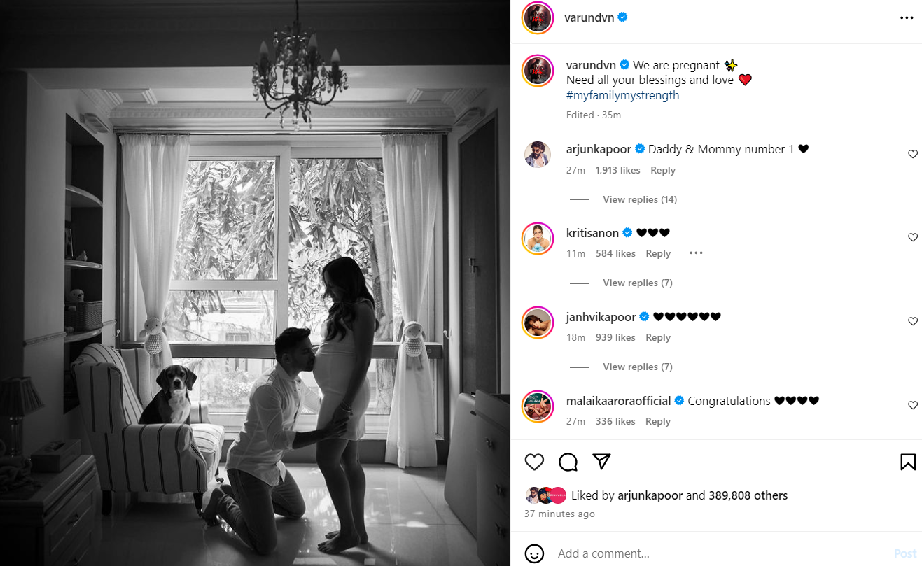 एक्टर के इस पोस्ट पर फैंस और सेलेब्स बधाई देते नजर आ रहे हैं। एक्टर अर्जुन कपूर ने लिखा, डैडी और मम्मी नंबर 1। मलाइका अरोड़ा ने लिखा, बधाई हो। कृति सेनन और जाह्नवी कपूर ने ब्लैक कलर के कई हार्ट इमोजी बनाए हुए हैं। सोनम कपूर ने लिखा, ओह माई गॉड। नेहा धूपिया ने लिखा, आप लोगों को बधाई ❤❤❤❤ बेस्ट हुड में आपका स्वागत है। वाणी कपूर ने लिखा, बधाई हो।