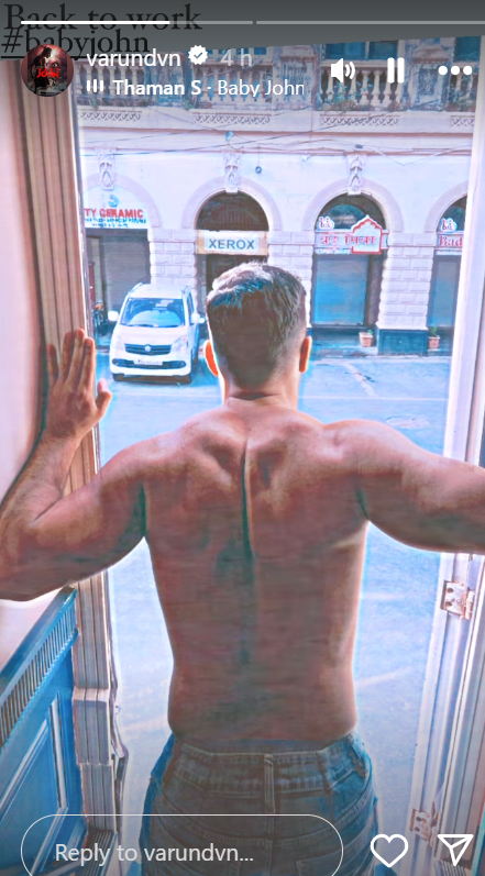 वरुण धवन ने आज रविवार को अपने सोशल मीडिया हैंडल इंस्टाग्राम पर अपनी आगामी एक्शन थ्रिलर फिल्म 'बेबी जॉन' के सेट से एक तस्वीर शेयर की है। फोटो में देखा जा सकता है कि एक्टर अपनी मस्कुलर बॉडी को फ्लॉन्ट करते हुए नजर आ रहे हैं। इस फोटो को शेयर करते हुए उन्होंने कैप्शन में लिखा, "बैक टू वर्क, बेबी जॉन"।