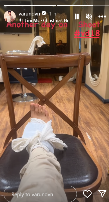 एक्टर वरुण धवन ने अपने सोशल मीडिया हैंडल इंस्टाग्राम की स्टोरी पर एक पोस्ट शेयर किया है। इस पोस्ट में उन्होंने इस बात की जानकारी दी है कि वह सेट पर घायल हो गए हैं। वरुण ने एक छोटी सी क्लिप शेयर करते हुए लिखा 'शूटिंग पर एक और दिन VD18'। क्लिप में देखा जा सकता है कि एक्टर के पैर पर पट्टी बंधी हुई है। बता दें कि फिलहाल वह केरल में इस मूवी की शूटिंग कर रहे हैं।