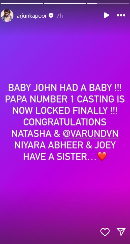 अर्जुन कपूर ने पोस्ट किया, 'बेबी जॉन को बेबी हुआ है। पापा नंबर 1 की कास्टिंग फाइनली लॉक हुई। वरुण और नताशा को बधाई। नियारा, अभीर और जॉय के पास अब एक बहन है।'