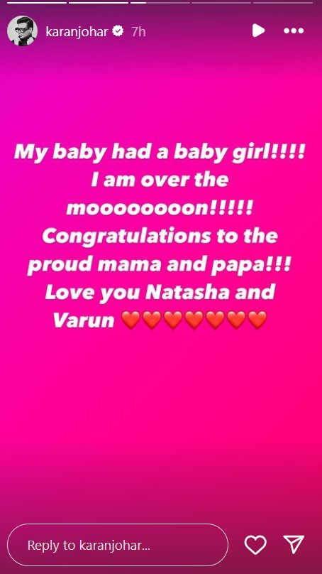 करण जौहर ने लिखा कि वह वरुण और नताशा के एक बेटी के पिता की खबर से बहुत खुश हैं। उन्होंने पोस्ट शेयर किया, 'मेरे बेबी को बेबी गर्ल हुई है। मैं बहुत खुश हूं। प्राउड मम्मा और पापा को बधाई। नताशा और वरुण आपको मेरा ढेर सारा प्यार।'