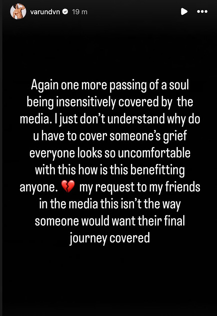 अब, अभिनेता वरुण धवन ने शेफाली की मौत के असंवेदनशील कवरेज के लिए मीडिया पर निशाना साधा है। एक्टर ने दुख की इस घड़ी में मीडिया सम्मान देने की बात कही है। रविवार को अपनी इंस्टाग्राम स्टोरी पर वरुण ने लिखा,"एक बार फिर एक आत्मा (शेफाली जरीवाला) के निधन को मीडिया द्वारा असंवेदनशील तरीके से कवर किया जा रहा है। मुझे समझ में नहीं आता कि आपको किसी के दुख को क्यों कवर करना है? हर कोई इससे इतना असहज दिख रहा है, इससे किसी को क्या फायदा हो रहा है। मीडिया के अपने दोस्तों से मेरा अनुरोध है कि इस तरह से कोई अपनी अंतिम यात्रा को कवर नहीं करना चाहेगा।"
