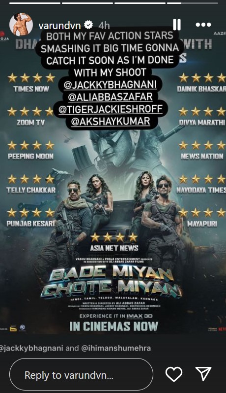 इसके साथ ही उन्होंने दूसरी स्टोरी में बड़े मियां छोटे मियां का पोस्टर शेयर करते हुए लिखा कि मेरे दोनों पसंदीदा एक्शन स्टार इसमें धूम मचा रहे हैं, जैसे ही मैं अपनी शूटिंग पूरी कर लूंगा, मैं इसे जल्द ही देखूंगा।