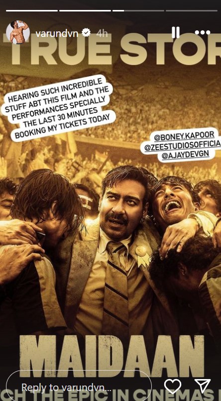 वरुण धवन ने अपने सोशल मीडिया हैंडल इंस्टाग्राम पर 'बड़े मियां छोटे मियां' और 'मैदान' को लेकर एक पोस्ट शेयर किया है। पहली स्टोरी में उन्होंने अजय देवगन की फिल्म मैदान का पोस्टर शेयर करते हुए लिखा कि इस फिल्म और प्रदर्शन के बारे में ऐसी अविश्वसनीय चीजें सुनीं, विशेष रूप से आखिरी 30 मिनट, आज मेरी टिकट बुक हो रही है।