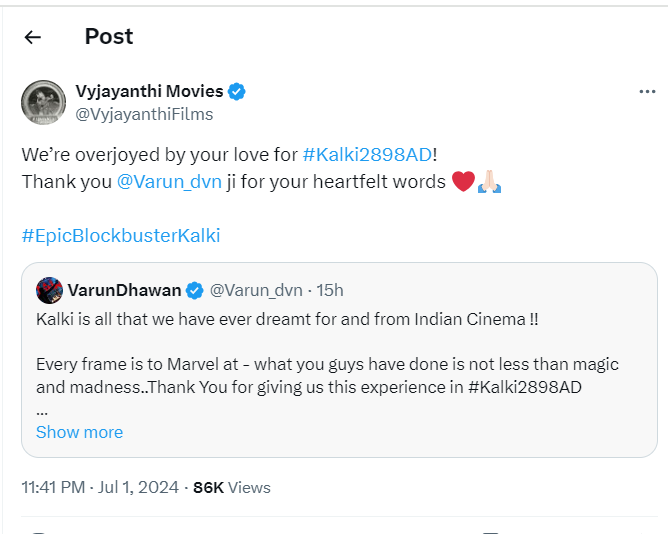 अमिताभ बच्चन, दीपिका पादुकोण, प्रभास और कमल हासन की मूवी को देखकर वरुण धवन को काफी मजा आया है। उन्होंने सोमवार को सोशल मीडिया एक्स अकाउंट पर एक पोस्ट शेयर कर लिखा- "कल्कि वह सब कुछ है, जिसका सपना हमने भारतीय सिनेमा के लिए देखा था।