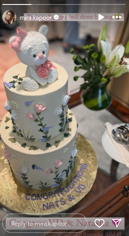 शाहिद कपूर की पत्नी मीरा राजपूत ने अपने सोशल मीडिया हैंडल इंस्टाग्राम की स्टोरी पर एक केक की तस्वीर शेयर की है। इस फोटो को शेयर करते हुए मीरा ने प्यारे से मैसेज के साथ कपल को बधाई भी दी है। फोटो में देखा जा सकता है कि एक क्यूट टेडी बियर केक दिखाई दे रहा है।