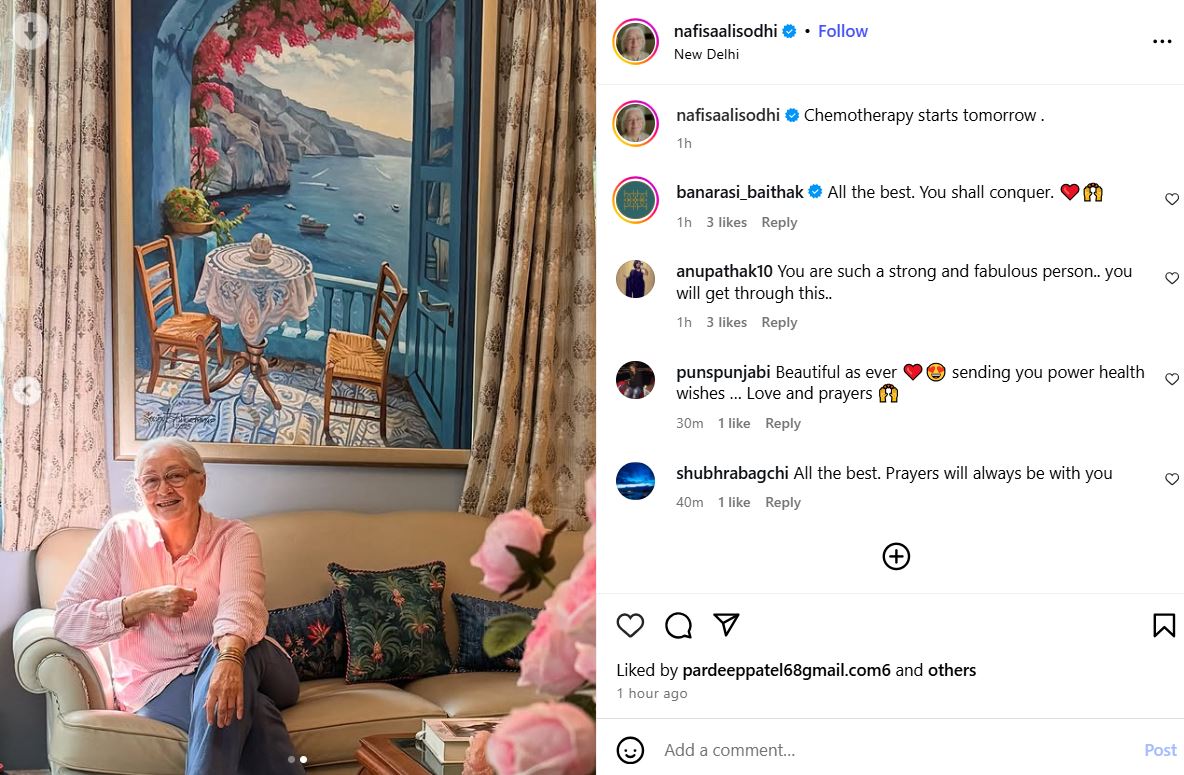 नफीसा अली एक और पोस्ट अपने इंस्टाग्राम पर पोस्ट करते हुए बताया कि उनकी कीमोथेरेपी कल से शुरू होगी। इससे पहले सीनियर आर्टिस्ट नफीसा अली ने पीटीआई से खास बातचीत में 2019 में बताया था कि वह मेडिकली कैंसर फ्री हो चुकी हैं और इंडस्ट्री में सीनियर एक्टर के तौर पर वापसी करना चाहती हैं। एक्ट्रेस ने ये भी बताया था कि वह सलमान खान की किसी फिल्म में दादी या फिर कोई एल्डर किरदार निभाना चाहती हैं।
