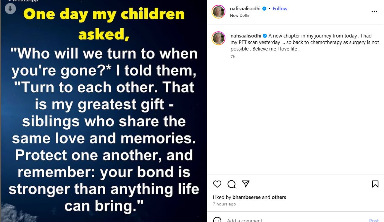 इस पोस्ट को शेयर करते हुए नफीसा अली ने लिखा, "मेरे सफर में एक नया चैप्टर जुड़ गया है। कल मेरा पेट स्कैन हुआ था, फिर से मेरी कीमोथेरेपी शुरू हो रही है, क्योंकि सर्जरी नहीं हो सकती। यकीन करो मुझे अपनी जिंदगी से बेहद प्यार है"।