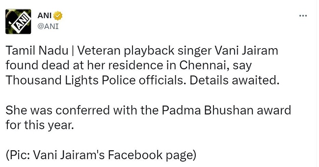 नई दिल्ली, जेएनएन। Vani Jairam Dead: तमिलनाडु से एंटरटेनमेंट इंडस्ट्री के लिए एक बुरी खबर आई है। सिंगर वाणी जयराम अपने घर पर मृत पाई गई है। इस बात की जानकारी पुलिस ऑफिशियल ने दी है। उन्हें हाल ही में पद्म भूषण पुरस्कार से सम्मानित किया गया था। सोशल मीडिया पर इस बात की जानकारी एएनआई ने ट्वीट कर दी है। उन्होंने अपने ट्वीट में लिखा है, 'तमिलनाडु की सदाबहार गायक वाणी जयराम अपने घर पर मृत पाई गई है। इस बात की जानकारी स्थानीय पुलिस स्टेशन ने दी है। उन्हें हाल ही में पद्म भूषण से सम्मानित किया गया था।'