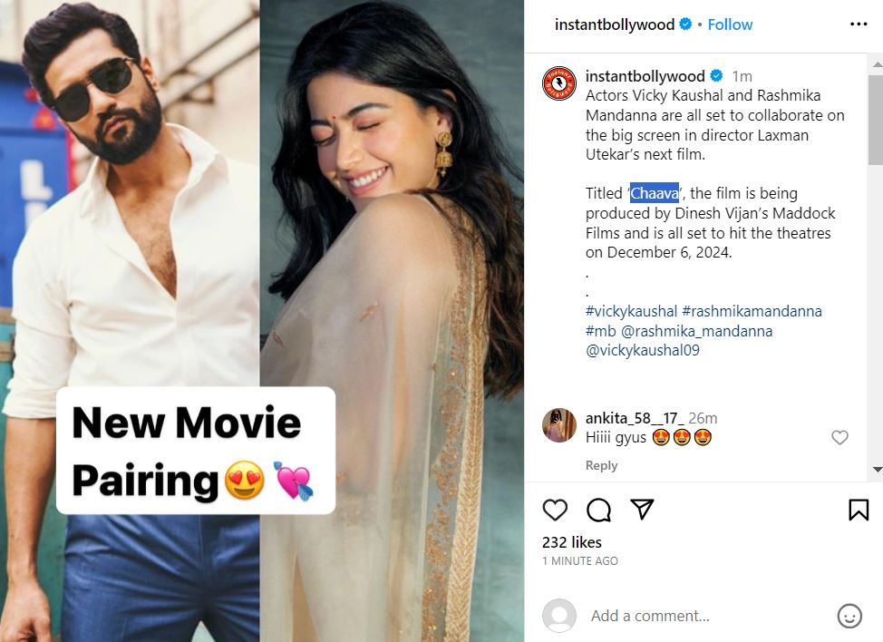 इंस्टेंट बॉलीवुड ने हाल ही में अपने इंस्टाग्राम अकाउंट पर जानकारी शेयर करते हुए बताया कि विक्की कौशल और रश्मिका मंदाना फिल्म 'छावा' में एक-दूसरे संग पहली बार स्क्रीन स्पेस शेयर करने जा रहे हैं। मैड्डॉक प्रोडक्शन के बैनर तले बन रही इस फिल्म के निर्देशन की कमान लक्ष्मण उतेरकर संभाल रहे हैं।