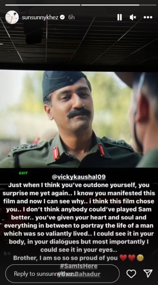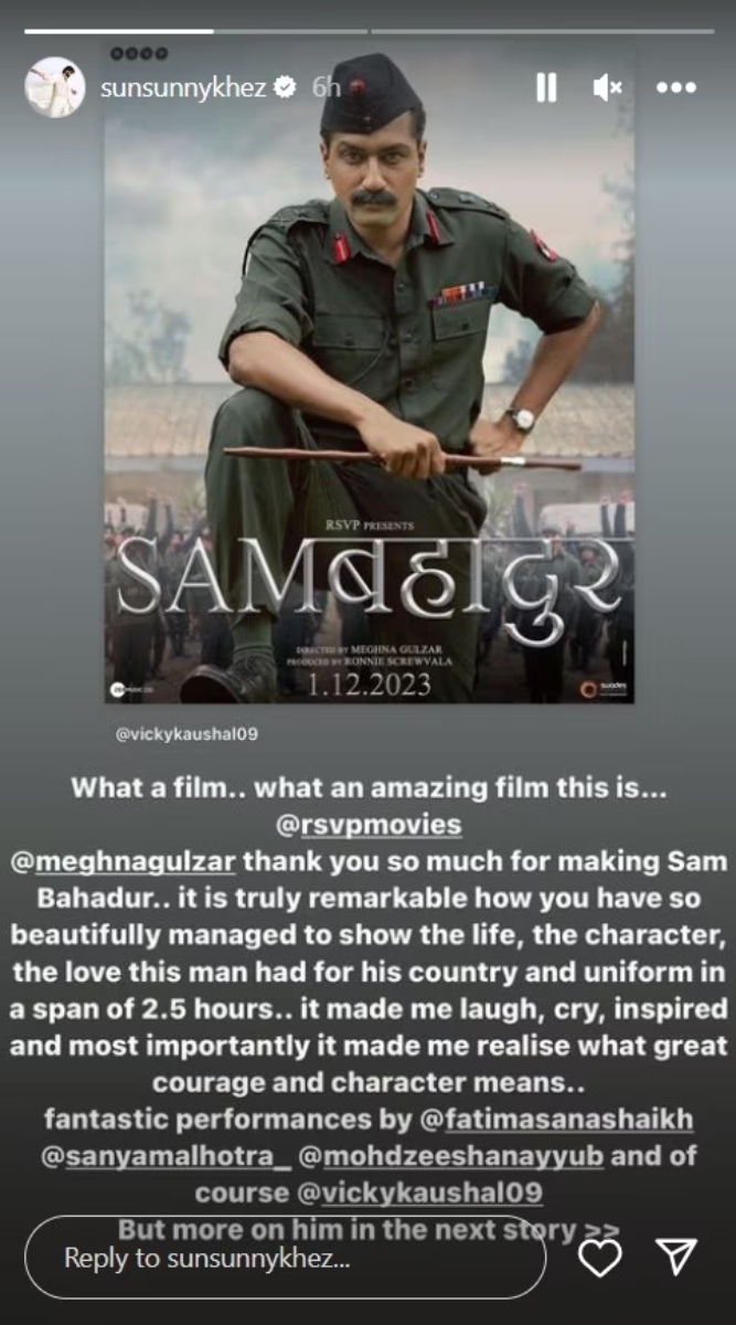 विक्की की फोटो शेयर कर सनी ने लिखा, क्या अमेजिंग फिल्म है..@rsvpmovies @meghnagalzar सैम बहादुर बनाने के लिए आपका बहुत-बहुत शुक्रिया। आपने इस आदमी के जीवन, चरित्र, प्यार को इतनी खूबसूरती से कैसे दिखाया है। इसने मुझे हंसाया, रुलाया, इंस्पायर किया और सबसे जरूरी बात यह है कि इसने मुझे एहसास कराया कि ग्रेट करेज और कैरेक्टर का क्या मतलब होता है।