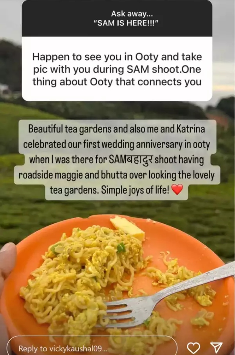 विक्की कौशल ने साल कटरीना कैफ से 9 दिसंबर साल 2021 में शादी रचाई थी। वहीं साल 2022 में इस कपल की शादी को पूरा एक साल हुआ था। ऐसे में अब एक्टर ने एक फैंस के पूछने पर खुलासा किया है उन्होंने अपनी पहली वेडिंग एनिवर्सरी कटरीना कैफ के साथ कैसे और कहा मनाई। विक्की ने बताया, खूबसूरत चाय के बाग में मैंने और कटरीना ने ऊटी में अपनी पहली शादी की सालगिरह मनाई थी। जब मैं सैम बहादुर के शूट के लिए वहां सड़क किनारे मैगी और भुट्टा खा रहा था।