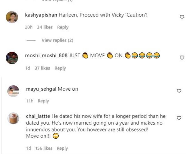 इस कैप्शन को देखने के बाद लोग एक्ट्रेस को खरी-खोटी सुना रहे हैं। यूजर्स हरलीन शेट्टी को जिंदगी में आगे बढ़ने की सलाह दे रहे हैं। एक यूजर ने हरलीन की पोस्ट पर कमेंट करते हुए लिखा, 'इससे आगे बढ़ने की कोशिश करो, अगर तुम उसमें फिट नहीं होती हो तो। अब तुम्हें नए ट्रैक सूट के लिए ट्राय करना चाहिए'। दूसरे यूजर ने लिखा, 'मूव ऑन गर्ल'। अन्य यूजर ने लिखा, 'उन्होंने अपनी पत्नी को इतने समय तक डेट किया, जितना उन्होंने आपको नहीं किया है। उनकी शादी को एक साल होने वाला है और उनकी जिंदगी में आपकी कोई जगह नहीं है। आप उनसे ऑब्सेस्ड हो'। मूव ऑन'।