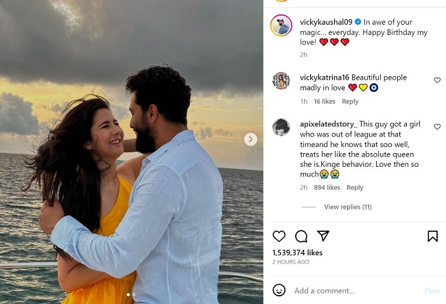 विक्की कौशल और कटरीना कैफ को समुद्र किनारे खड़े होकर पोज देते हुए देखा जा सकता है। दोनों काफी खुश नजर आ रहे है। फोटोज में समुद्र भी नजर आ रहा है। एक्ट्रेस ने पीली ड्रेस पहन रखी है, जबकि विक्की कौशल ने हल्की नीली शर्ट पहन रखी थी। तस्वीरें शेयर करते हुए विक्की कौशल ने लिखा है,