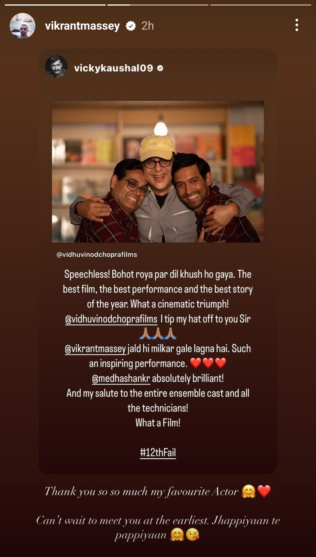 फिल्म 12th फेल ने फैंस से लेकर सेलेब्स पर अपना काफी अधिक प्रभाव छोड़ा है। ओटीटी प्लेटफॉर्म पर 12th फेल को देखने के बाद विक्की कौशल ने अपने ऑफिशियल इंस्टाग्राम हैंडल पर एक लेटेस्ट स्टोरी शेयर की है। इस स्टोरी में अभिनेता ने लिखा है-