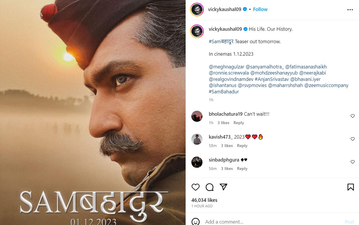 विक्की कौशल ने सैम बहादुर के लुक में नया पोस्टर शेयर करते हुए फैंस को बताया कि मेघना गुलजार के निर्देशन में बनी इस फिल्म का टीजर कल यानी कि 13 अक्टूबर को रिलीज किया जाएगा, जो ICC Cricket World Cup 2023 में इंडिया और पाकिस्तान के मैच के दौरान परसों स्टेडियम में दिखाया जाएगा।