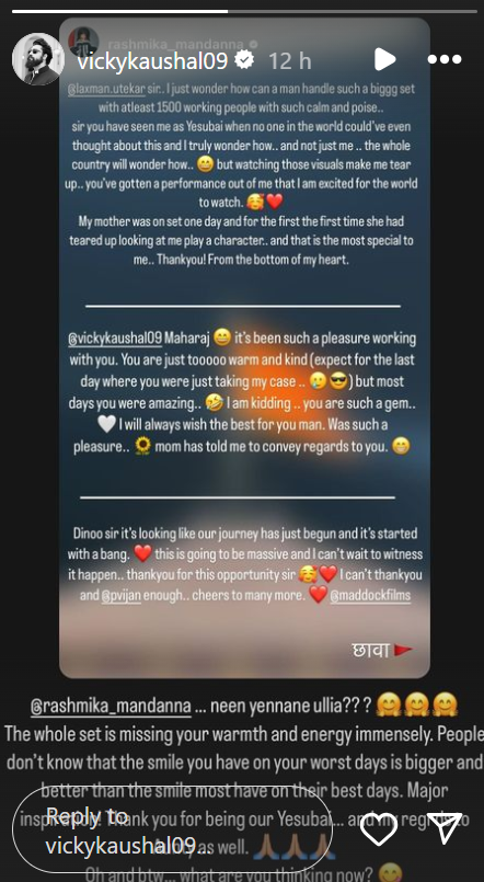 इसके बाद सोशल मीडिया हैंडल इंस्टाग्राम पर विक्की कौशल ने भी रश्मिका के पोस्ट का जवाब दिया। विक्की ने लिखा, 'नीं येन्नने उलिया? पूरा सेट आपकी गर्मजोशी और ऊर्जा को बेहद मिस कर रहा है। लोग यह नहीं जानते कि आपके बुरे दिनों में जो मुस्कान होती है, वह अधिकांश लोगों के सबसे अच्छे दिनों में होने वाली मुस्कान से बड़ी और बेहतर होती है। प्रमुख प्रेरणा। हमारी येसुबाई बनने के लिए धन्यवाद और आंटी के प्रति मेरा भी आभार। ओह वैसे भी अब आप क्या सोच रहे हैं'।