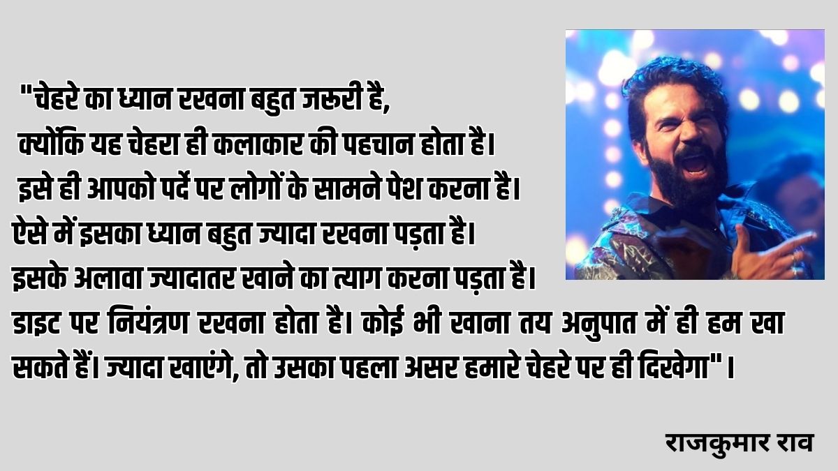 "जब मैं अभिनेता नहीं था, ऐसी कई जरूरी बातों की जानकारी नहीं थी, तब तो कुछ भी खा लेते थे। अब पता है कि मीठा खाने का मन भी है, तो ज्यादा नहीं खाना है। थोड़ा सा ही खाकर काम चलाना है। पेट भरने के लिए कुछ भी नहीं खाना है। जब अभिनेता नहीं बना था, तो जिंदगी वाकई बहुत अलग थी। चेहरा जरूर बचाना था, लेकिन खाने पर किसी तरह की रोक-टोक नही थी"।