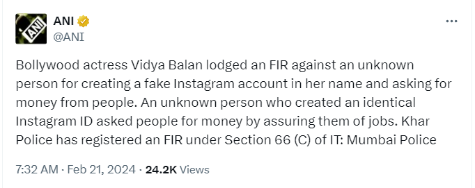 इस रिपोर्ट में ये बताया गया कि विद्या बालन के नाम से एक शख्स ने इंस्टाग्राम पर फेक आईडी (vidya balan fake insta id) बनाई हुई है, जहां पर वो लोगों से पैसों की डिमांड कर रहा था। इतना ही नहीं, वह शख्स विद्या बालन के नाम पर सिर्फ पैसों की ठगी नहीं कर रहा था, बल्कि उन्हें नौकरी दिलाने का वादा भी कर रहा था। मुंबई पुलिस ने आईपीसी की धारा 66 के तहत यह मामला दर्ज किया है।