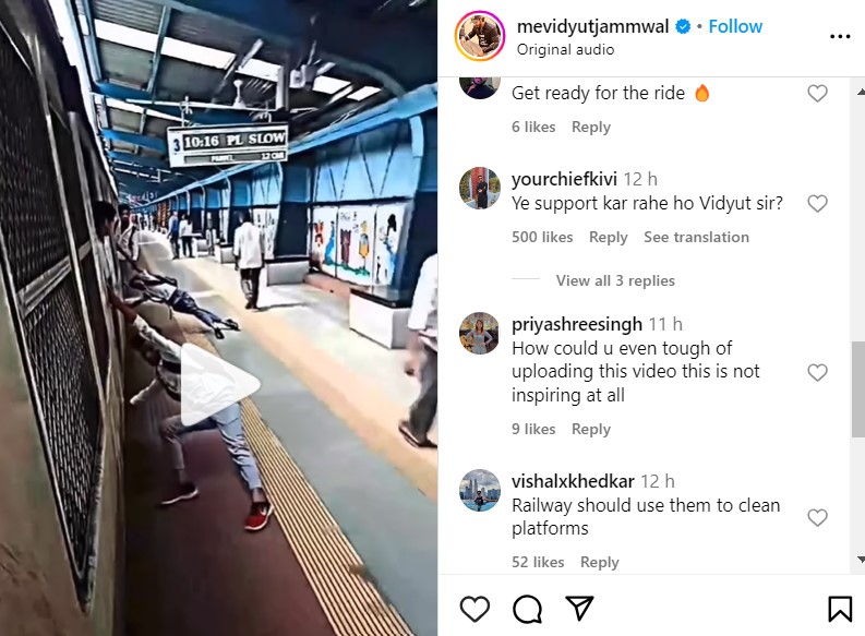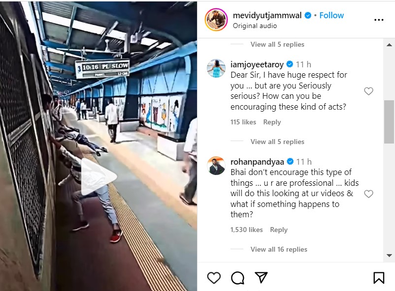 विद्युत जामवाल को सलाह देते हुए एक फैन ने कहा, "भाई इस तरह की चीजों को बढ़ावा मत दो... आप तो प्रोफेशनल हो... आपका वीडियो देखकर बच्चे ये सब करेंगे, सोचिए इसका नतीजा क्या होगा।" वहीं, दूसरे फैन ने कहा, "आप इस तरह के वीडियो को अपलोड करने के बारे में भी कैसे सोच सकते हो, ये बिल्कुल भी प्रेरणा देने वाला नहीं है।"