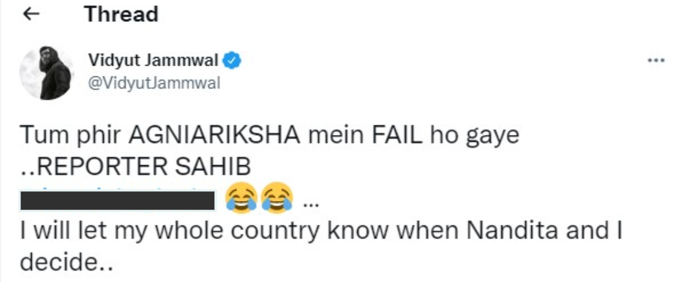 विद्युत जामवाल ने गर्लफ्रेंड नंदिता महतानी से शादी की खबरों का खंडन करते हुए एक मीडिया हाउस की क्लास लगा दी है। एक्टर ने ट्विटर के जरिए अपना गुस्सा व्यक्त किया। नंदिता महतानी से शादी की खबर पर भड़के विद्युत् जामवाल ने ट्वीट करते हुए लिखा, 'तुम फिर अग्नि परीक्षा में फेल हो गए...मैं पूरे देश को बताऊंगा जब मैं और नंदिता शादी करने का निर्णय लेंगे'।