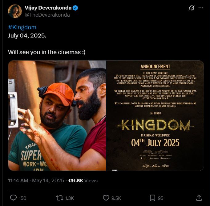 विजय देवरकोंडा ने जैसे ही नई रिलीज डेट का ऐलान किया, सोशल मीडिया पर फैंस की प्रतिक्रियाओं की बाढ़ आ गई। कुछ फैंस ने निराशा जताई, लेकिन ज्यादातर ने मेकर्स के इस फैसले का समर्थन किया। एक फैन ने लिखा, “विजय की फिल्म के लिए और इंतजार कर सकते हैं, बस धमाका होना चाहिए!” यह दूसरी बार है जब ‘किंगडम’ की रिलीज टली है, इससे पहले इसे 28 मार्च से टाला गया था। फैंस अब जुलाई में विजय के इस एक्शन अवतार को देखने के लिए उत्साहित हैं।