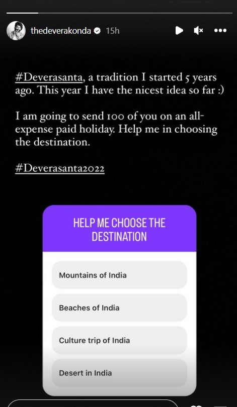 प्लान शेयर करते हुए एक्टर ने लिखा, 'एक परंपरा है जो पांच साल पहले शुरू की थी। इस साल मेरे पास शानदार आइडिया आया है। मैं आपमें से 100 लोगों को पेड ट्रिप पर भेजना चाहता हूं। डेस्टिनेशन चुनने में मेरी करें। #Devarasanta2022' इसके बाद विजय ने चार ऑप्शन दिए जहां वह फैंस को भेजना चाहते हैं। यह ऑप्शन हैं- माउंटेन ऑफ इंडिया, बीचेस ऑफ इंडिया, कल्चर ट्रिप ऑफ इंडिया और डेसर्ट ऑफ इंडिया। यानी की वह फैंस को उनकी ही पसंदीदा जगह पर भेजेंगे।
