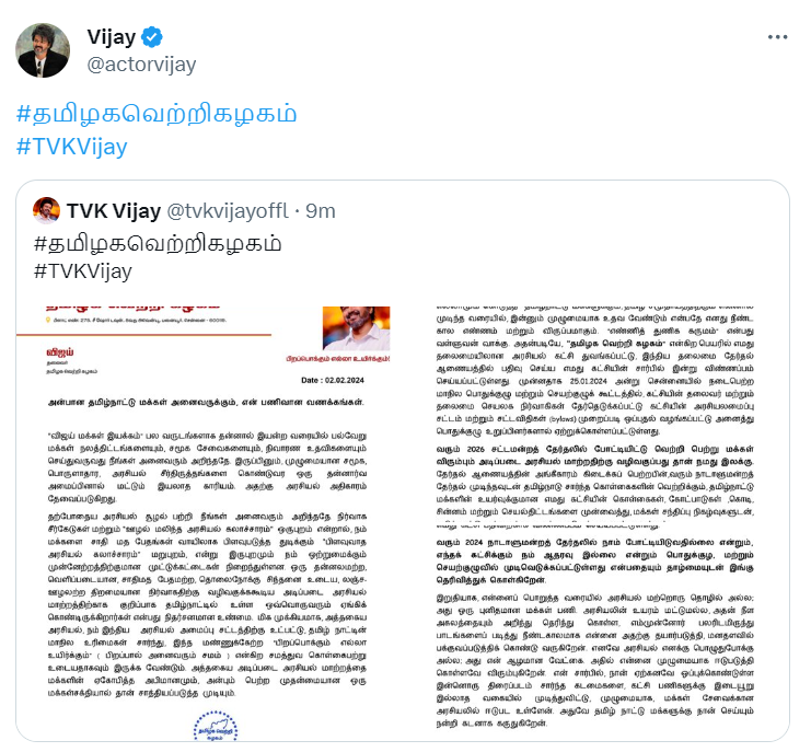 मास्टर और वरिसु जैसी कई शानदार मूवीज के जरिए फैंस का भरपूर करने वाले कलाकार विजय थलापति की राजनीति में एंट्री की खबर को लेकर सुर्खियां काफी तेज हैं। 2 फरवरी को विजय थलापति ने अपने ऑफिशियल एक्स अकाउंट पर एक लेटेस्ट ट्वीट किया है।