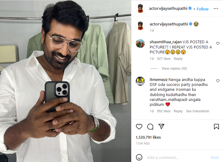 विजय सेतुपति की इस तस्वीर को अब तक लाखों फैंस लाइक कर चुके हैं। वहीं इस पर कमेंट कर उनकी लगातार तारीफ भी कर रहे हैं। इस पर कमेंट कर एक यूजर ने लिखा, 'सर, आप हमेशा से ही स्मार्ट लगते हो।' वहीं एक दूसरा लिखता है, ' आपका अकाउंट हैक तो नहीं हो गया है। एक और यूजर ने कहा- 'क्या तो चेंज है। आप जैसा कोई नहीं। इस तरह के ना जाने कितने कमेंट्स विजय की इस तस्वीर पर आ रहे हैं।