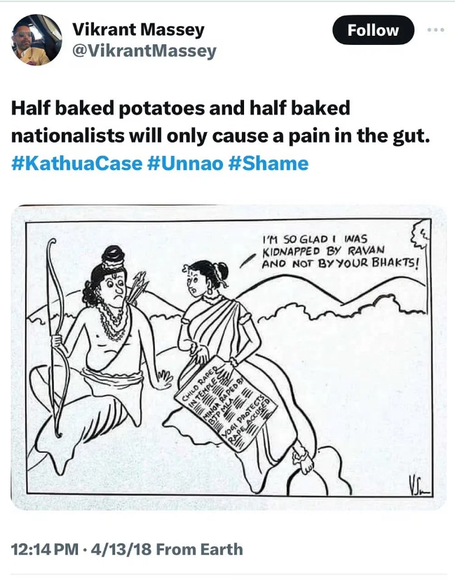 दरअसल विक्रांत मैसी ने 2018 में अपने ट्विटर अकाउंट पर एक कार्टून पोस्ट शेयर किया था, जिसमें श्रीराम और माता सीता फीचर थे। उनके इस ट्वीट पर यूजर्स भड़क उठे थे। एक्टर पर हिंदुओ की भावनाओं को आहत करने का आरोप लगा था। अब हाल ही में विक्रांत मैसी ने अपने इस ट्वीट के लिए माफी मांगी है।