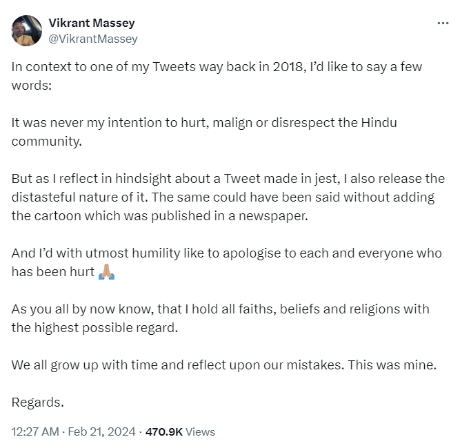 विक्रांत मैसी ने 2018 में किये गए उस ट्वीट के लिए माफी मांगते हुए लिखा, "मैं अपने साल 2018 में किये गए ट्वीट से जुड़ी कुछ बातों के बारे में कहना चाहता हूं। मेरा इरादा कभी भी हिंदू कम्यूनिटी की भावनाओं को आहत करना या उनका अपमान करना नही था। लेकिन जैसे ही में मजाक में किये गए उस पुराने ट्वीट के बारे में सोचता हूं, तो मुझे लगता है कि मैं उस वक्त कैसे कड़वी बात कही थी।