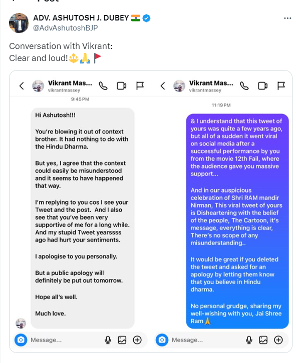 विक्रांत मैसी ने खुद तो ट्वीट करके माफी मांगी ही, लेकिन इसी के साथ उनका मुंबई के एक वकील आशुतोष जे दुबे के साथ हुई बातचीत का एक स्क्रीनशॉट भी सोशल मीडिया पर वायरल हो रहा है।