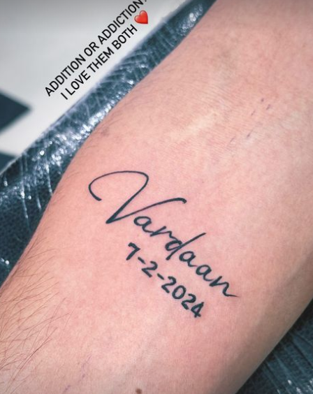 विक्रांत मैसी ने अपने सोशल मीडिया हैंडल इंस्टाग्राम की स्टोरी पर एक तस्वीर शेयर की है। इस फोटो में देखा जा सकता है कि उन्होंने अपने बेटे वरदान के नाम का टैटू अपने हाथ पर बनवाया है। सिर्फ इतना ही नहीं, अभिनेता ने बेटे वरदान के जन्म की तारीफ 7-2-2024 भी उसके साथ लिखवाई है।